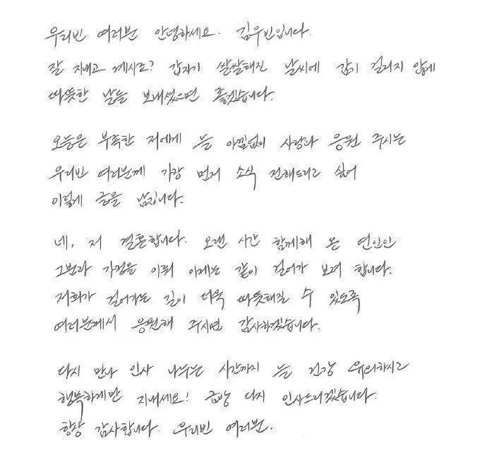 11月20日,据荆楚网,韩国男星金宇彬发手写信官宣与申敏儿结婚。信中写道:“对,我要结婚了,和长时间以来一起的那位恋人,准备组成家庭一直走下去了。”